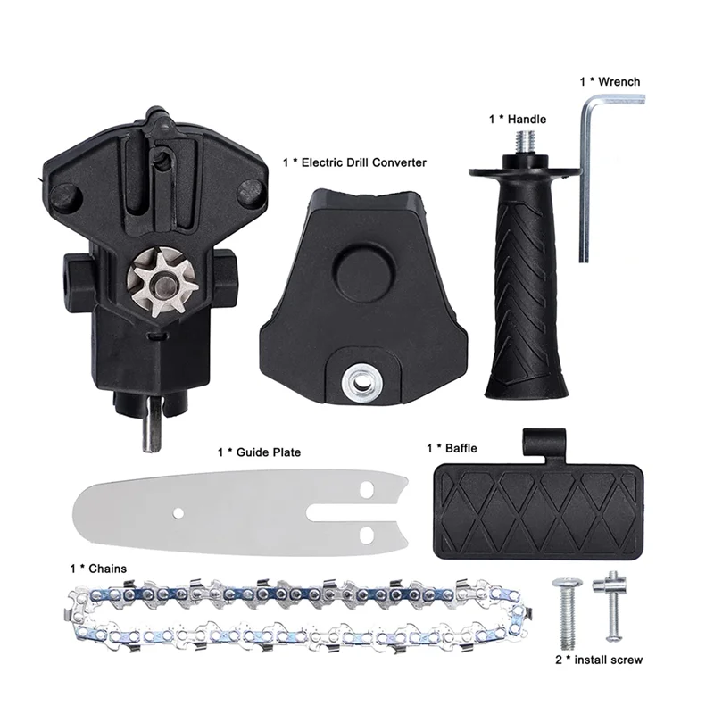 Verwandeln Sie Ihren handelsüblichen Elektrobohrer im Handumdrehen in ein kompaktes Kettensäge-Werkzeug. Dieser praktische Adapter ist ideal für leichte Schneidarbeiten im Garten, beim Heimwerken oder für schnelle Einsätze, bei denen eine große Kettensäge zu unhandlich wäre.